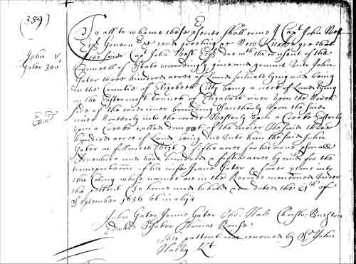 On 26 July 1638 John Gater was granted 800 acres in the Lower County of New Norfolk. The land description was the same as the previous grant, and was for the transportation of John Gater, Jane Gater, Tho. Hale, Christ. Barston, Edward Besaker, Tho. Rouse, Wm. Plesbery, Rich. Tisley, Thomas Merrideth, Fr. Merrideth, Tho. Meades, Robert ---, Wm. Goldsmith, Wm. Rice, Edward Windett, and Wm. Johnson.