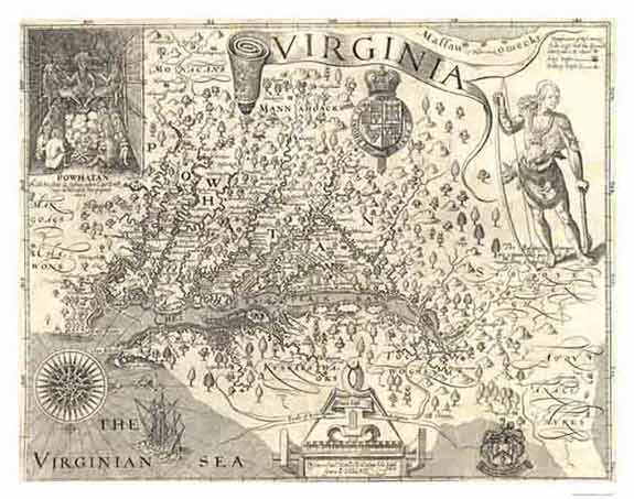 It might have been due to the chronic lack of "civilized" women in the New World that he again returned to England where he married a certain Joan. In 1635 the family travels back to Virginia. The ship list of the "Assurance", dated 14 July 1635, reads: "Jo: Gater aged 36, Joan Gater age 23, and Jo: Gater age 15. Jamestown was founded on May 14, 1607, by a small group led by Captain Christopher Newport, who was hired by the London Virginia Company to transport colonists. It was to become the first permanent English settlement in America. It is located in present-day James City County, on an island in the James River, southeast of Richmond, part of the 3816-hectare (9430-acre) Colonial National Historical Park. Of 6,000 settlers the London based Virginia Company sent to Jamestown between 1607 and 1625, 4,800 died. The colonists were poorly chosen - with far too many gentlemen, servants and specialized artisans and far too few farmers. The colony was poorly led, its officers engaged more in power struggles than in making sure that Jamestown had enough food, a healthy source of water, and well-maintained defenses. The settlers worked hard - at enterprises that met with only mixed success. Virginia Company investors wanted colonists to extract New World riches. Instead of spending time growing crops, settlers were instructed to search for gold and other commodities and turn Virginia's raw materials into profitable industries while bartering with Indians for food. Recent excavations found great quantities of scraps of copper - leftovers from pieces cut and shaped into ornamentsprized by Indians. Copper was supposed to buy the colonists' food, but two things happened that the Virginia Company did not foresee. First, sailors on the ships that brought and supplied the settlers made calendestine black-market deals with the Indians that glutted the copper market and devalued the metal. Then drought took hold of Tidewater Virginia. Recent studies of tree rings have revealed that 1606-1612 was Jamestown's driest seven year period in 770 years. Indian tribes that had eagerly provided corn stopped. No amount of copper would change their minds. The English response - raiding Indian villages to seize food - provoked attacks by that left James Fort besieged. In 1609-1610 the crisis reached a critical time known as the "Starvation Time". Archeological excavations unerthed remains of this desperate winter. Within the fort lay butchered bones of animals the settlers would only have eaten in extreme hunger - cats, dogs, horses, rats, snakes, even poisonous ones. Utterly spent and without food, the remaining colonists in 1610 boarded ships to abandon Jamestown. As they began to sail away, a supply ship arrived. The settlers returned to Jamestown and the colony endured to become Virginia's first capital. To recruit more colonists, raise capital, and control the sale of the new cash crop, tobacco, the Virginia Company started issuing parcels of land to settlers and to others who bought shares. As a further incentive to colonists, the company created the Virginia General Assembly in 1619. It was the first represantative body, the origin of the American form of government. Settlers could own land and vote - private enterprise and fredom - the seeds that would grow into the United States. For Indians it would mean near extinction. For Africans shipped to tobacco plantations it would mean slavery. But for colonists willing to risk death on a frontier, it would mean unheard of opportunity.