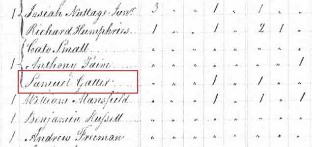 By 1810 we find Samuel Gatter living in Boston. The household has now shrunk to 3 persons. Samuel Gatter in the age-group 26-45 years (comparing with the agegroups of the 1800 census he cannot be older that 36), another female between 26-45 (his wife?... she was said to have died young), and a child below 10 years of age.