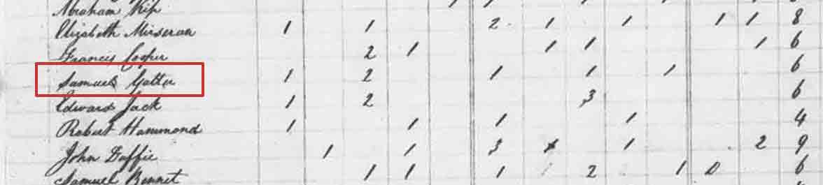 In the 1800 Census we find Samual Gatter living in New York. His household consists of 6 free white persons (3 males and 3 females). He posesses no slaves. If we interpret the little date we have. We come to the conclusion that both he and his wife are in the age group between 16 and 26 years of age. This mens he was probably born between 1774 and 1780. The couple gas two children below 10 years of age (one boy, one girl). In the household lives another male of 16-26 years of age (maybe a brother or a lodger), and female above 45 yers of age (mother, mother in law?). The son below 10 years of age listed in the census is quite